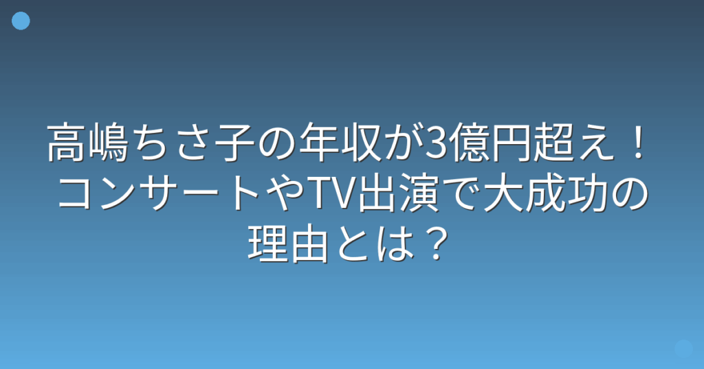人気ヴァイオリニストの高嶋ちさ子さんの収入について、大きな注目が集まっていますね。 クラシック音楽家としては異例の高収入を誇り、テレビ出演やコンサート活動など、多岐にわたる活躍をされています。 そこで今回は、高嶋ちさ子さんの年収や収入源に... -