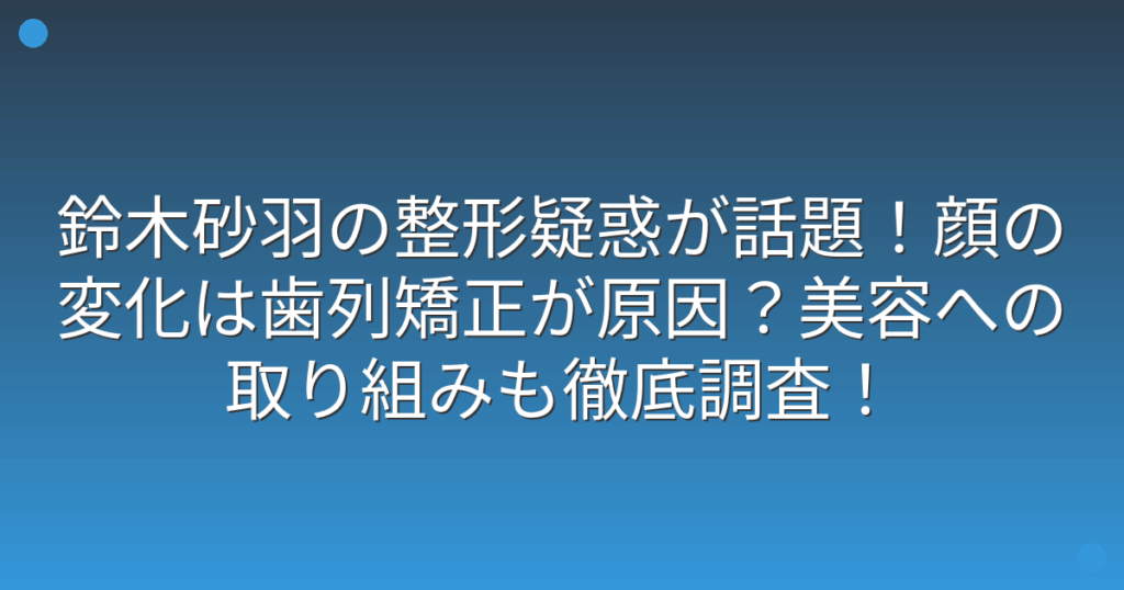 最近、女優の鈴木砂羽さんの顔の変化が大きな話題を呼んでいます。 特にSNS上では「整形したのでは?」という声が多く上がっており、注目を集めています。 そこで今回は、鈴木砂羽さんの整形疑惑や顔の変化の真相について、詳しく見ていきましょう! 鈴木... -
