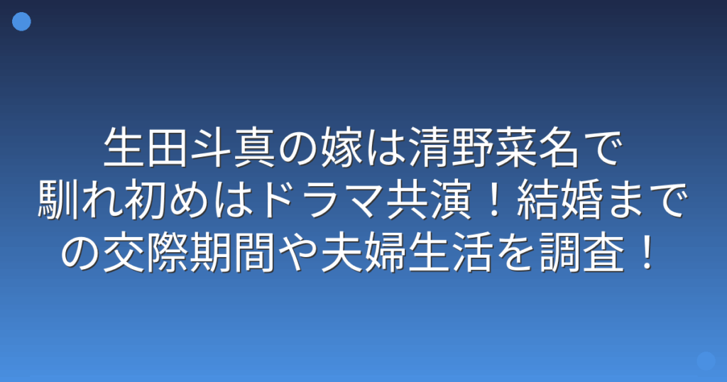 俳優の生田斗真さんが2020年に結婚したことは大きな話題となりましたね。 お相手は同じく俳優として活躍する清野菜名さんで、ドラマ共演をきっかけに交際がスタートしたと言われています。 そこで今回は、生田斗真さんの嫁である清野菜名さんとの馴れ初め...
