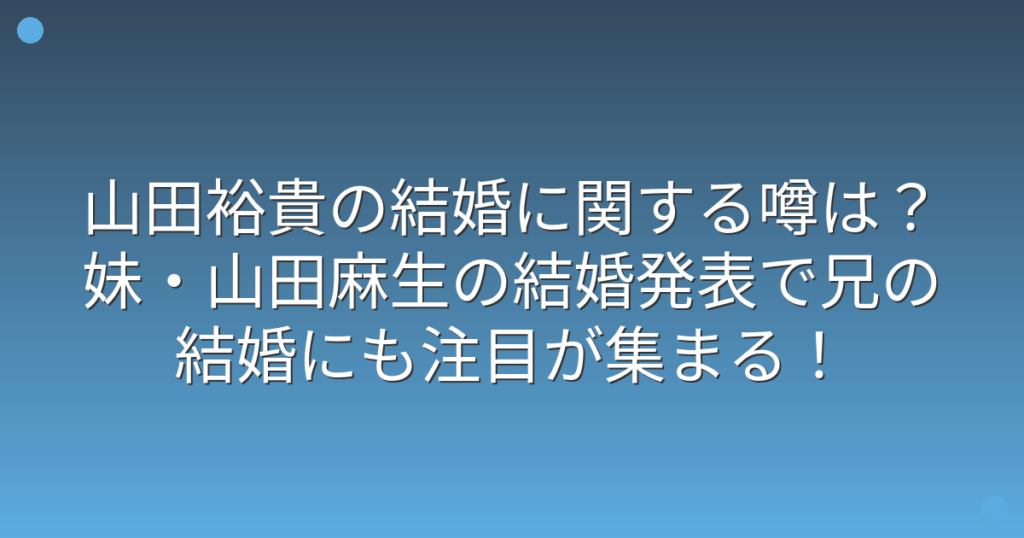人気俳優の山田裕貴さんの結婚について、ファンの間で大きな関心が寄せられています。 特に最近、妹の山田麻生さんが結婚を発表したことで、兄である山田裕貴さんの結婚についても注目が集まっているようです。 そこで今回は、山田裕貴さんの結婚に関する...