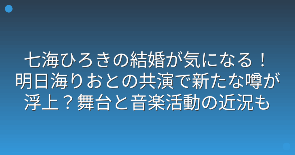 元宝塚歌劇団の人気男役スター・七海ひろきさんの結婚について、ファンの間で関心が高まっています。 特に2025年8月の明日海りおさんとの共演をきっかけに、プライベートな話題にも注目が集まっているようです。 そこで今回は、七海ひろきさんの結婚に関す... -