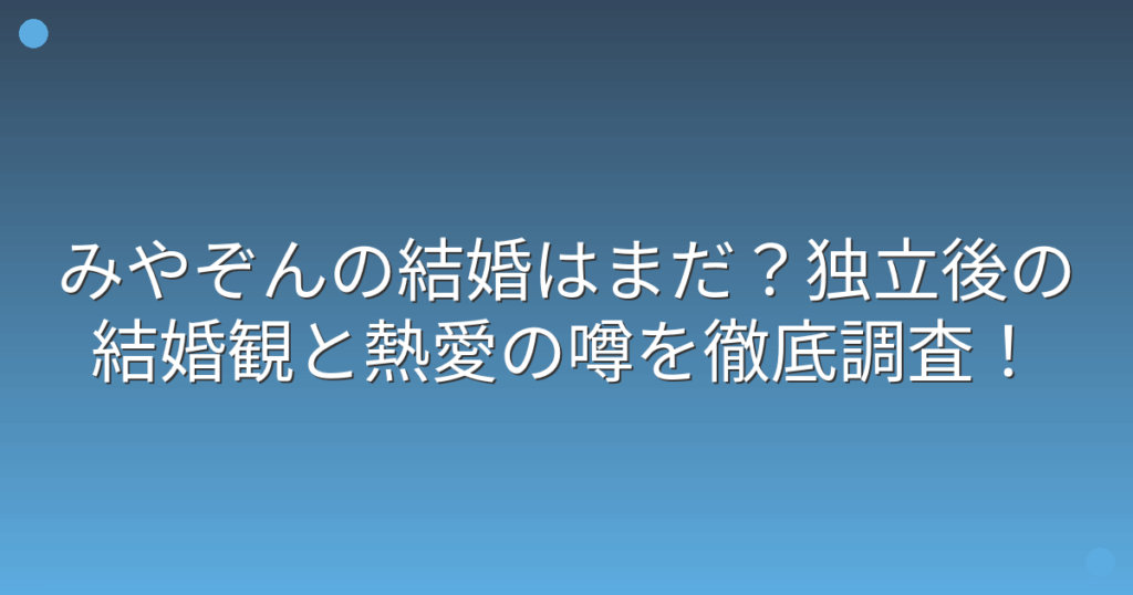 人気タレントのみやぞんさんの結婚について、多くの方が気になっているようですね。 2023年末の事務所退所や2024年のANZEN漫才解散後、さらに注目が集まっています。 そこで今回は、みやぞんさんの結婚に関する最新情報や、熱愛の噂について詳しく見ていき... -
